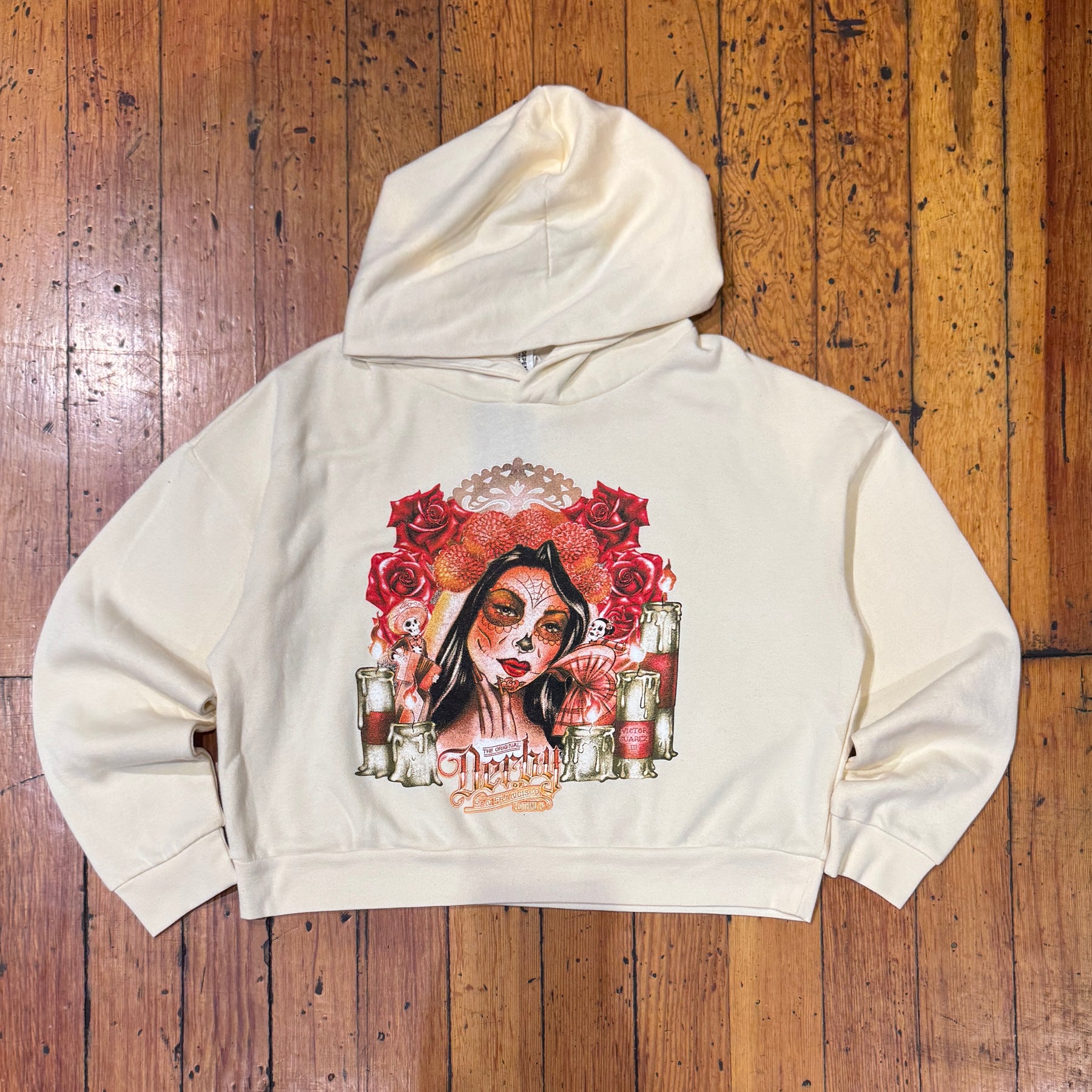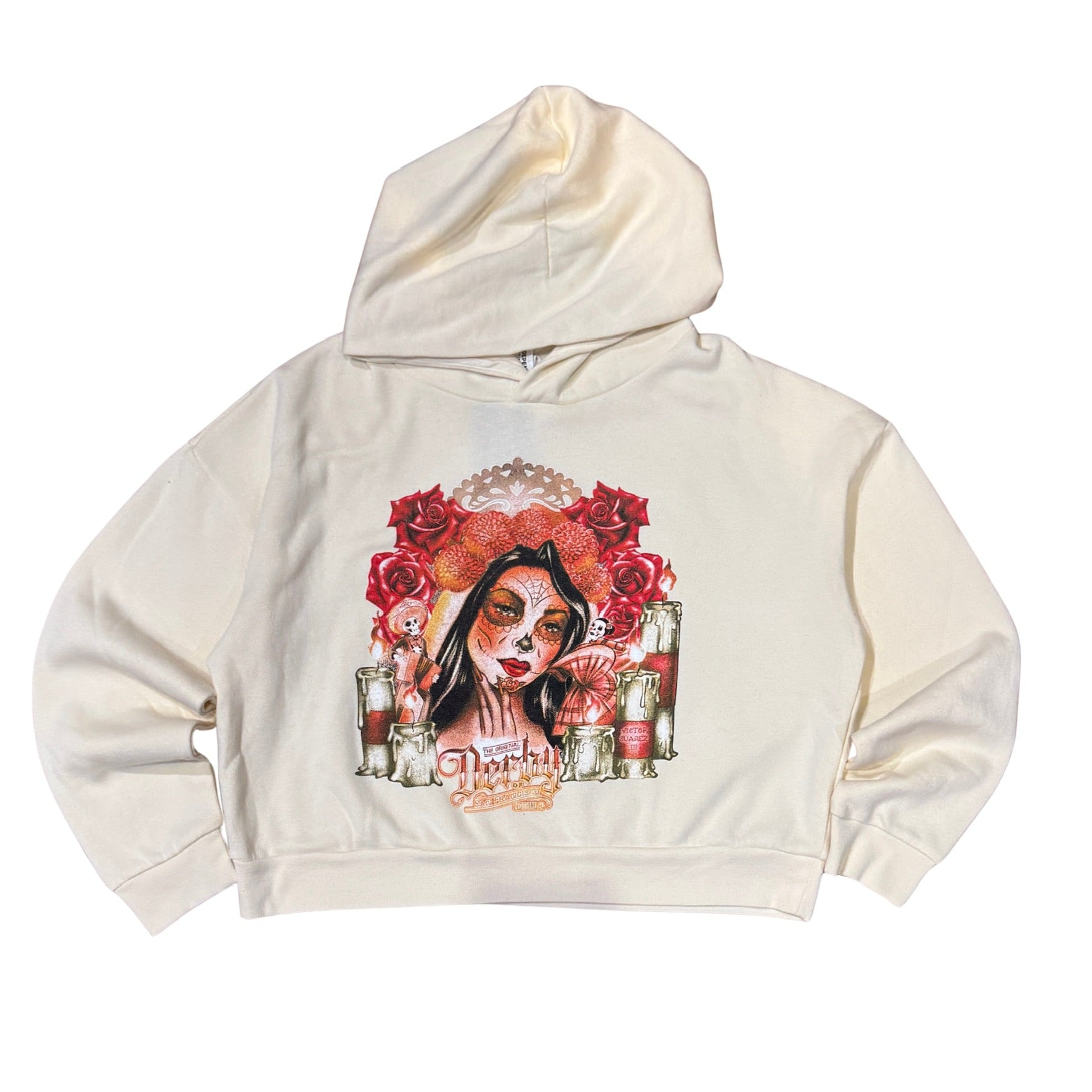 Day of the death Women Crop Hoodie in Black featuring artwork by Cecelia Perez (@hey.ruca).