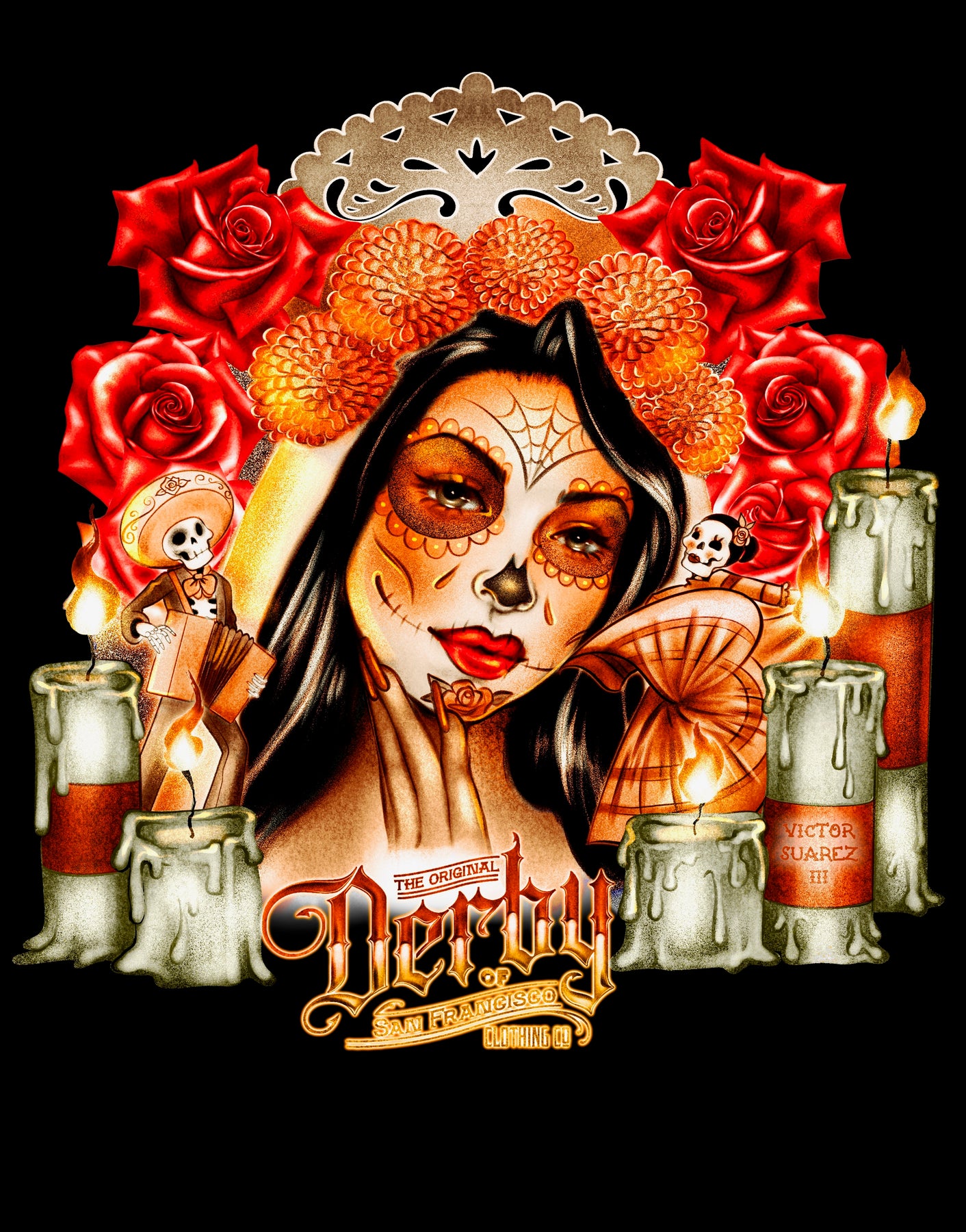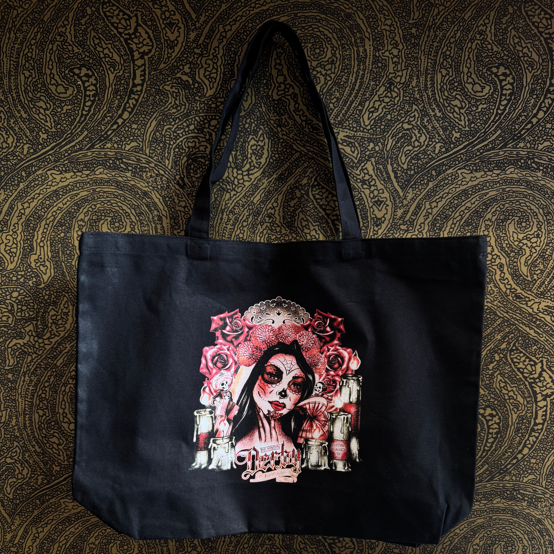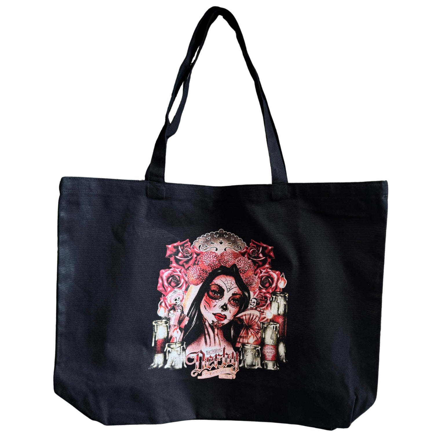 Black Jumbo Tote bag featuring artwork by Cecelia Perez (@hey.ruca). The design pays homage to Día de los Muertos, celebrating Mexican culture and tradition. Part of a limited collection featuring the same vibrant artwork across multiple items.